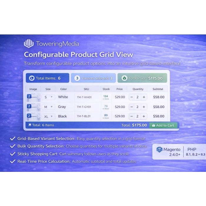 Selling configurable products shouldn’t force customers through repetitive dropdown selections or one-variant-at-a-time add-to-cart flows. When shoppers want multiple sizes, colors, or variants, the default Magento experience creates friction — especially for high-volume, wholesale, or repeat buyers.
