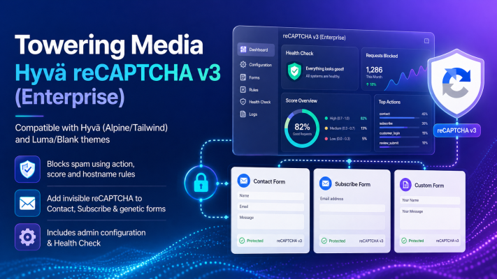 Toweringmedia Hyvä reCAPTCHA v3 Enterprise adds invisible Google bot protection for Magento 2 Hyvä stores, securing forms and checkout while keeping the customer experience smooth.